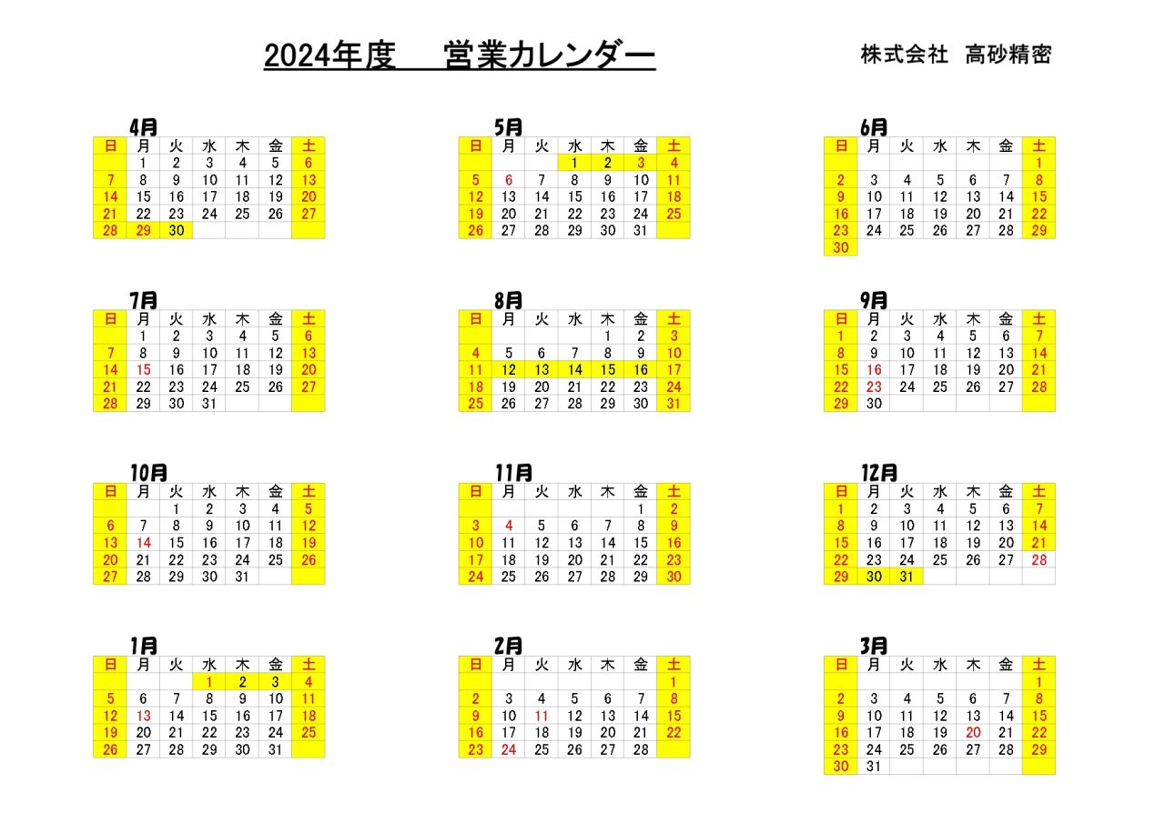 稼働日などのお知らせ