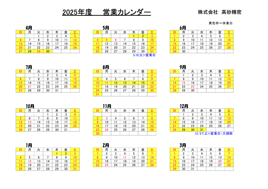 2025年度営業日カレンダーのお知らせ